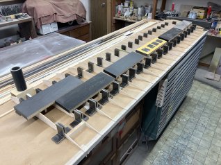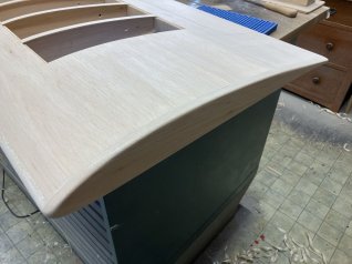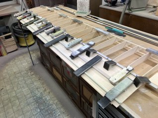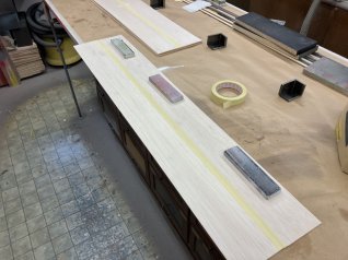 Die Beplankungsbretter werden auf dem Tisch zusammengeklebt und die Übergänge verschliffen
