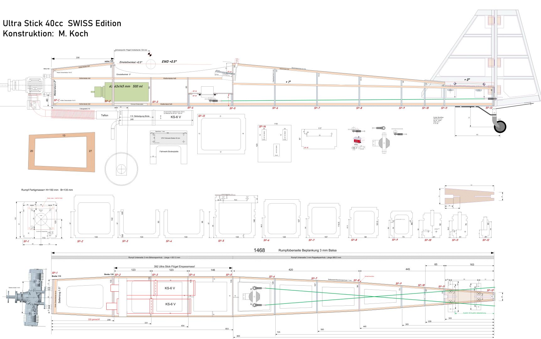 Das Rumpfhiterteil ist um 60 mm verlängert worden und der letzte Rumpfspannt hat die doppelte Höhe. Der Motorspannt wurde in der Breite sowie auch in der Höhe um 10 mm vergrössert. Mit diesen Massnahmen ist der Rumpf verwindungssteifer und vibrationsarmer aufgebaut und es lassen sich dadurch leistungsstarke Verbrennungsmotoren in der Grösse von 40-70 ccm betreiben, was für ein 2-Meter Modellflugzeug ausreichend sein sollte. Eine Schleppkupplung ist ebenfalls verbaut.