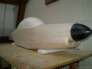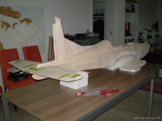 Der Rumpf mit Leitwerk und 4fach verschraubtem Mittelflügel (M4- Imbusschrauben) sind im Rohbau fast fertig