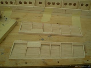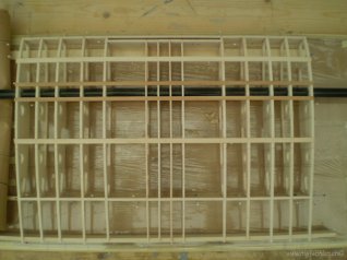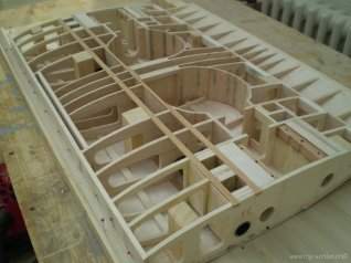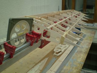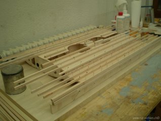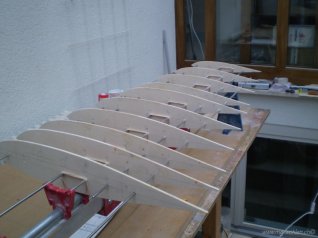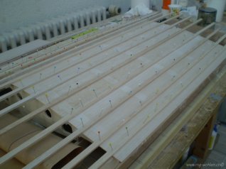 Rippen mit Stringern und Hilfsholmen auf der Helling verleimt