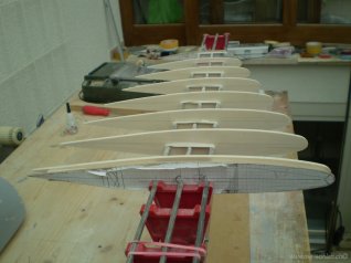Gerippe des rechten Aussenflügels mit Wurzelrippe für 7° V-Form und 0.5° Schränkung zwischen Wurzelrippe und Randbogen auf der Helling