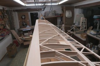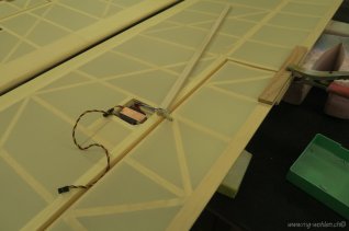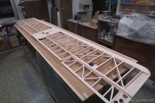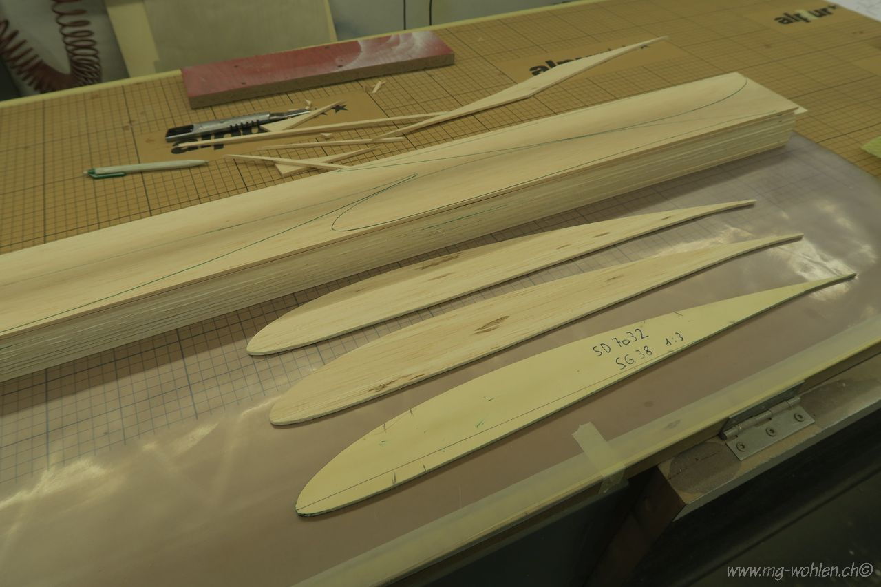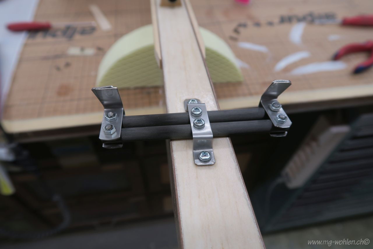 Die Tragflächen bestehen aus Balsarippen und auch Balsa Holme jedoch mit einer Zwischenlage mit CFK Rovings. Bei der Steckung wurden zur Sicherheit 4 Sperrholzrippen eingebaut.