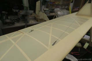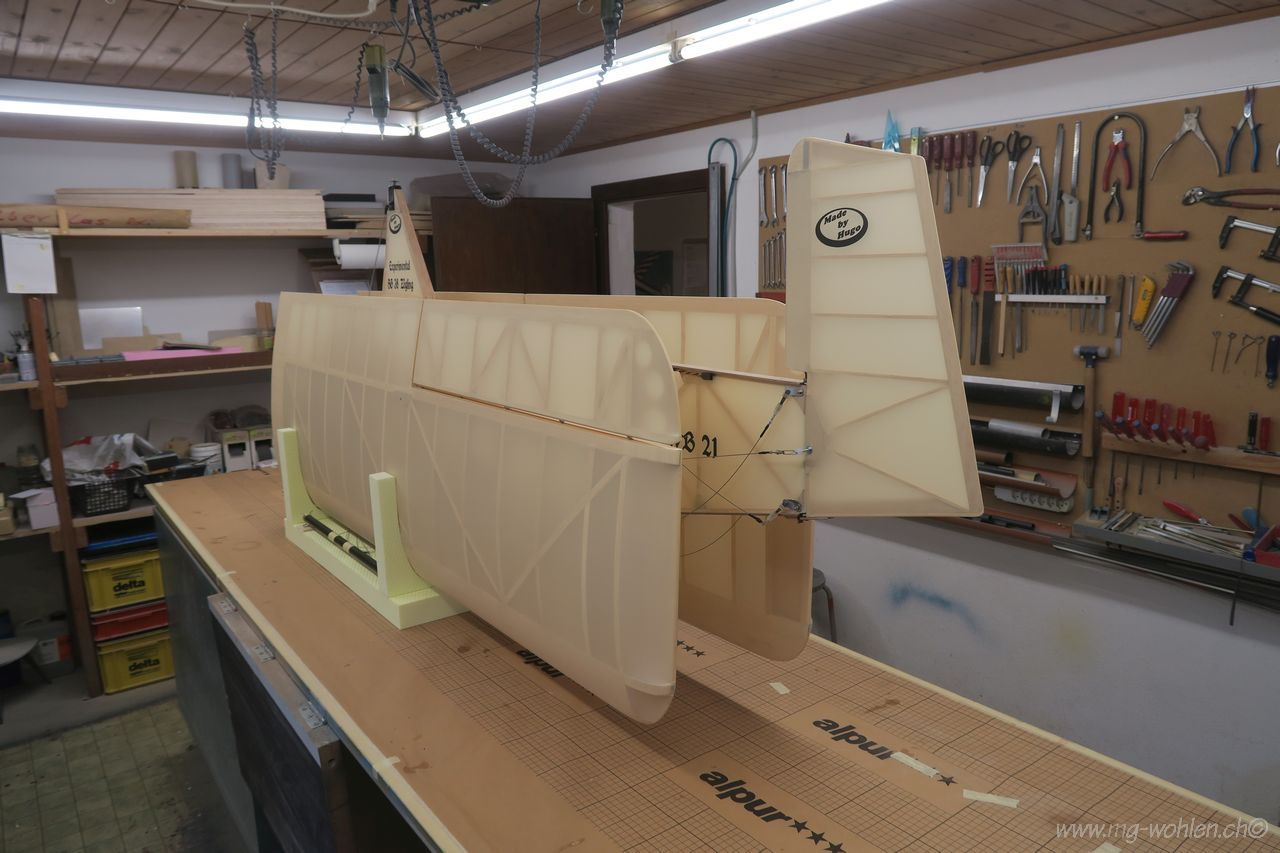 Das Höhenleitwerk ist konventionelle Stäbchenbauweise aber auch beidseitig mit Glasgewebe verstärkt.