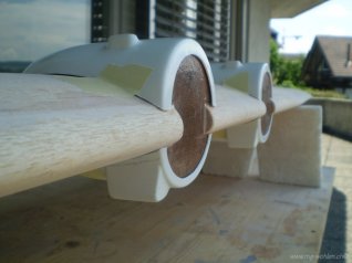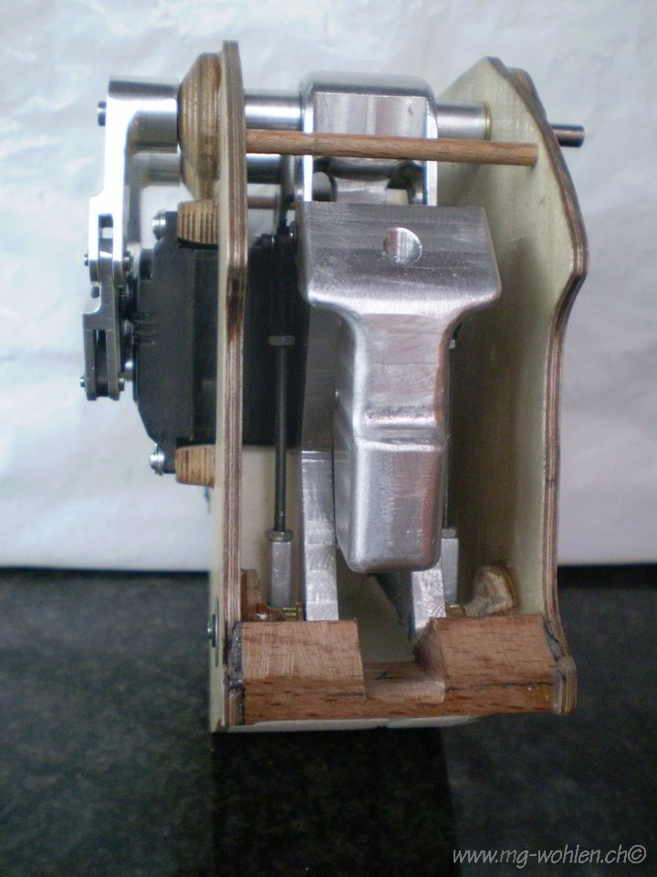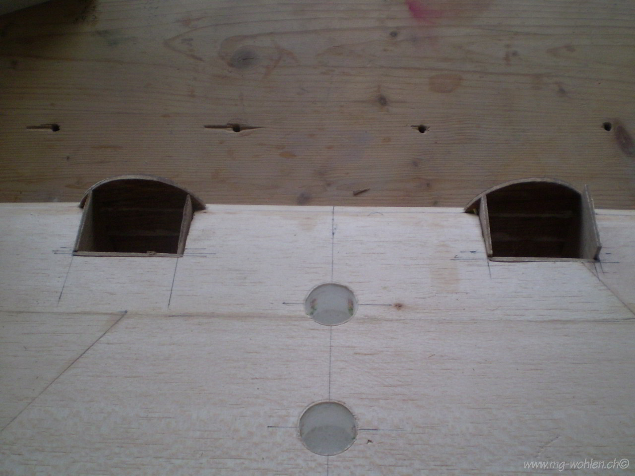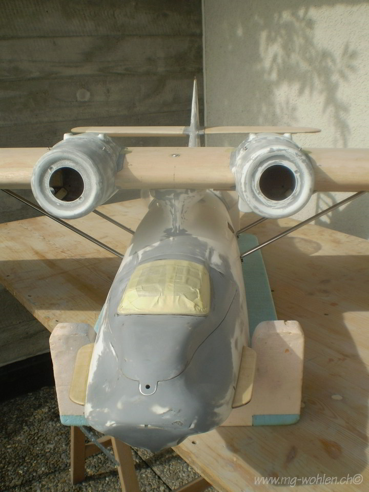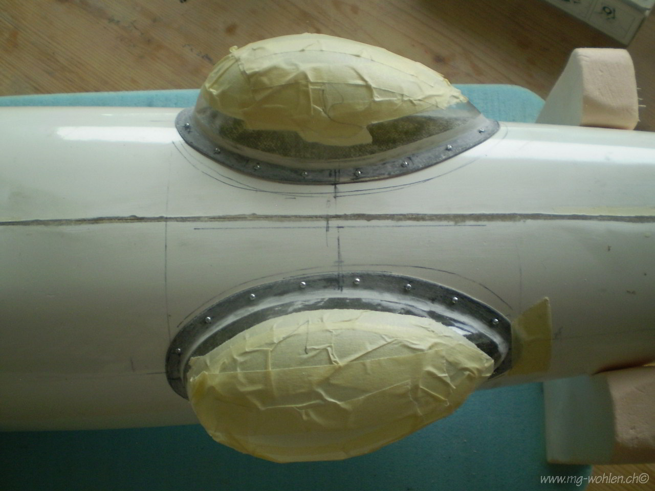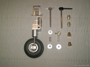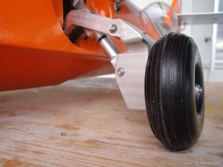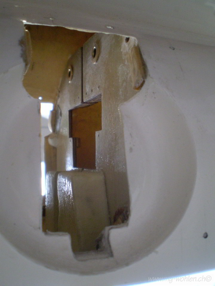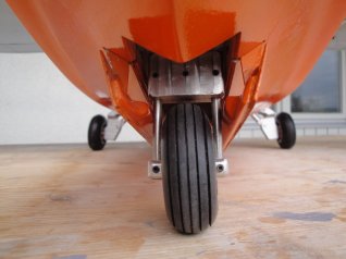 Also erstellte ich mit den Dreh- und Fräsmaschinen aus Alu, Stahl, Bronze und CFK die 2 etwas komplizierteren Hauptfahrwerke. Das beim Einfahren sich selbst neutralisierende Bugfahrwerk war dann einfacher herzustellen. Die Hauptfahrwerke sind zwischen 2 fest eingeharzten Sperrholzspanten gelagert. Diese 2 Spanten bilden einen Schott. Da durch die Fahrwerkschächte unvermeidbar Wasser in diesen Schott dringt ist dieser mit möglichst viel Styropor ausgefüllt. Das eingedrungene Wasser fliesst nach dem Abwassern durch ein am tiefsten Punkt gebohrtes kleines Loch wieder ab. Das Bugrad ist in einem abgedichteten Sperrholzschacht gelagert. Hier eingedrungenes Wasser kann durch den kleinen Spalt der Bugradtore ebenfalls abfliessen. Alle Achsen und Wellen der Fahrwerke sind mittels „Boots-Wasserfett“ und Flachscheiben abgedichtet.