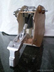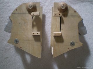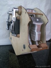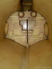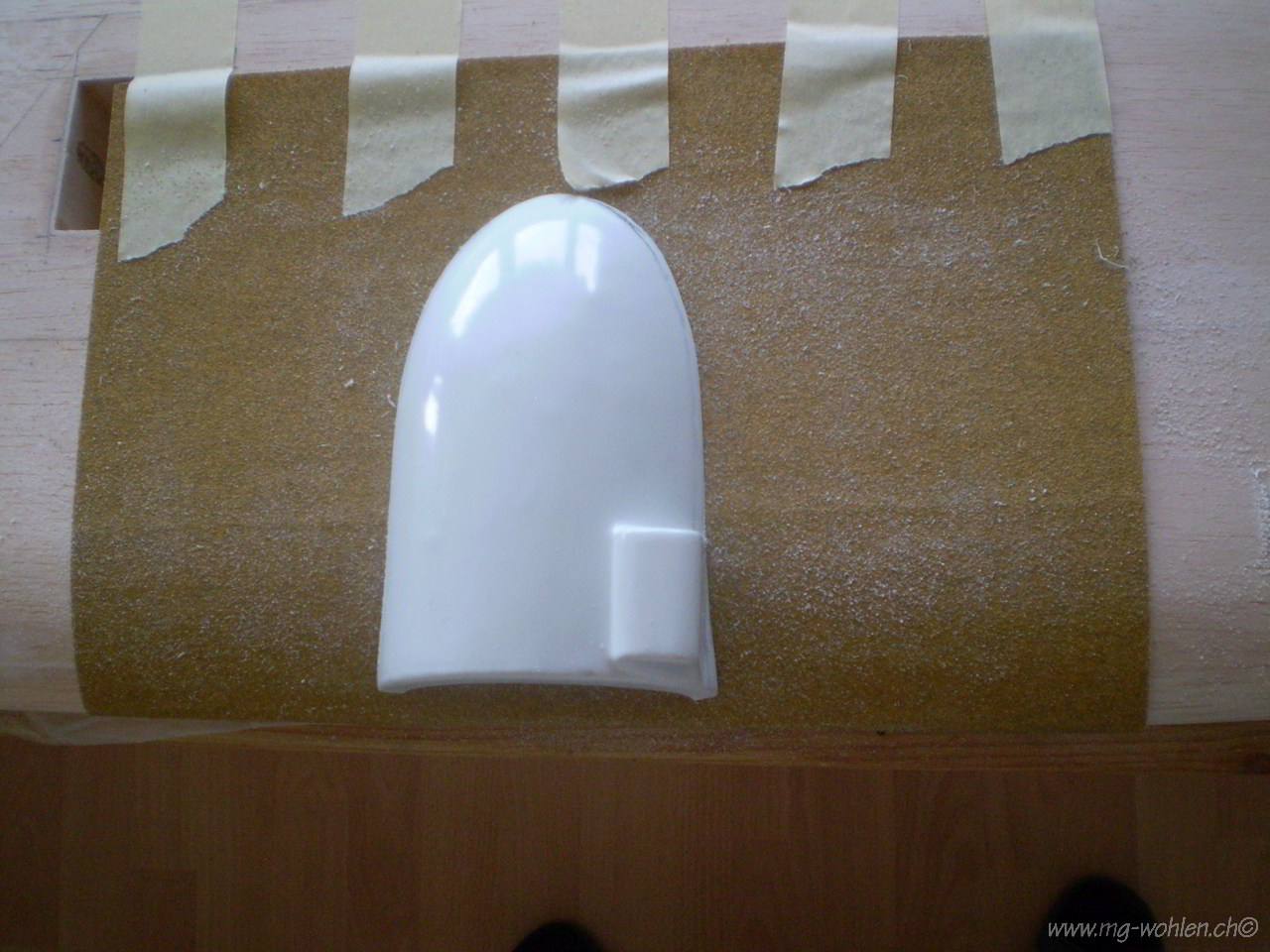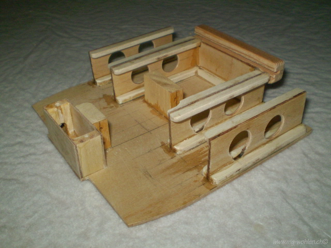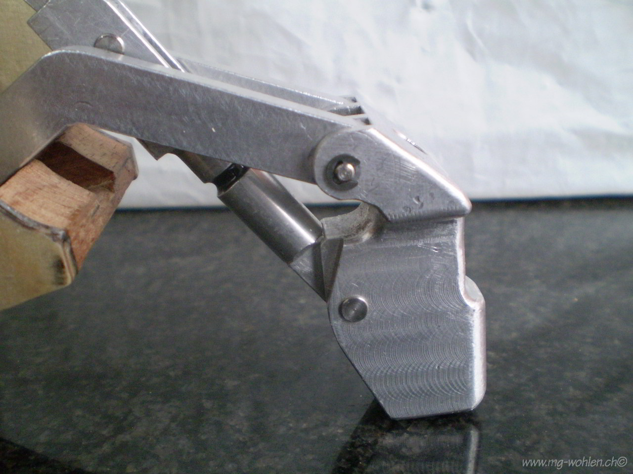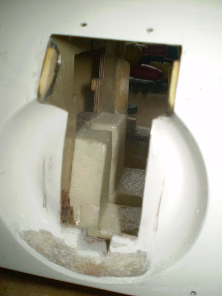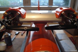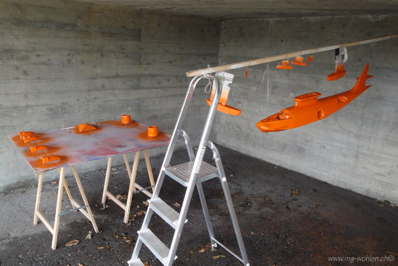 Also erstellte ich mit den Dreh- und Fräsmaschinen aus Alu, Stahl, Bronze und CFK die 2 etwas komplizierteren Hauptfahrwerke. Das beim Einfahren sich selbst neutralisierende Bugfahrwerk war dann einfacher herzustellen. Die Hauptfahrwerke sind zwischen 2 fest eingeharzten Sperrholzspanten gelagert. Diese 2 Spanten bilden einen Schott. Da durch die Fahrwerkschächte unvermeidbar Wasser in diesen Schott dringt ist dieser mit möglichst viel Styropor ausgefüllt. Das eingedrungene Wasser fliesst nach dem Abwassern durch ein am tiefsten Punkt gebohrtes kleines Loch wieder ab. Das Bugrad ist in einem abgedichteten Sperrholzschacht gelagert. Hier eingedrungenes Wasser kann durch den kleinen Spalt der Bugradtore ebenfalls abfliessen. Alle Achsen und Wellen der Fahrwerke sind mittels „Boots-Wasserfett“ und Flachscheiben abgedichtet.