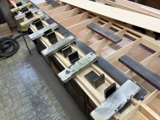 Die Beplankungsbretter werden auf dem Tisch zusammengeklebt und die Übergänge verschliffen