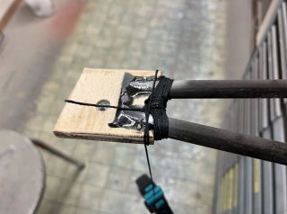 Die untere Halterung wird massiv mit Zwirn umwickelt